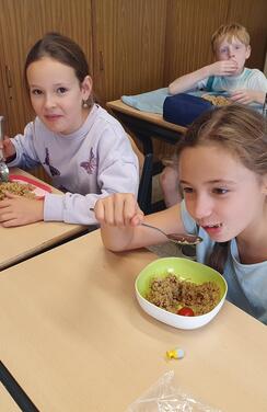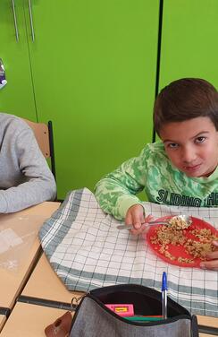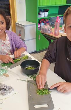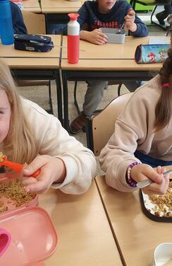 4e en 5e leerjaar gaat aan de slag met een kookpakket met producten uit de wereldwinkel. Ook deze leerkrachten duiden de herkomst van de producten.