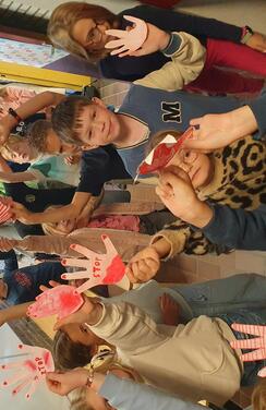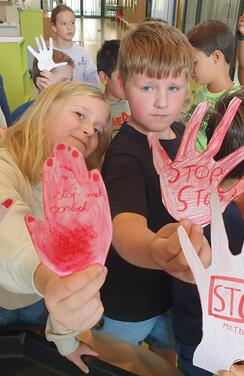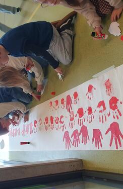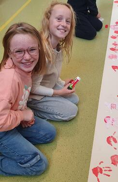 Met de hele school trokken we een meterslange rode lijn tegen de oorlog in Gaza. Ook wij staken onze handen uit en riepen "Stop" tegen oorlog.