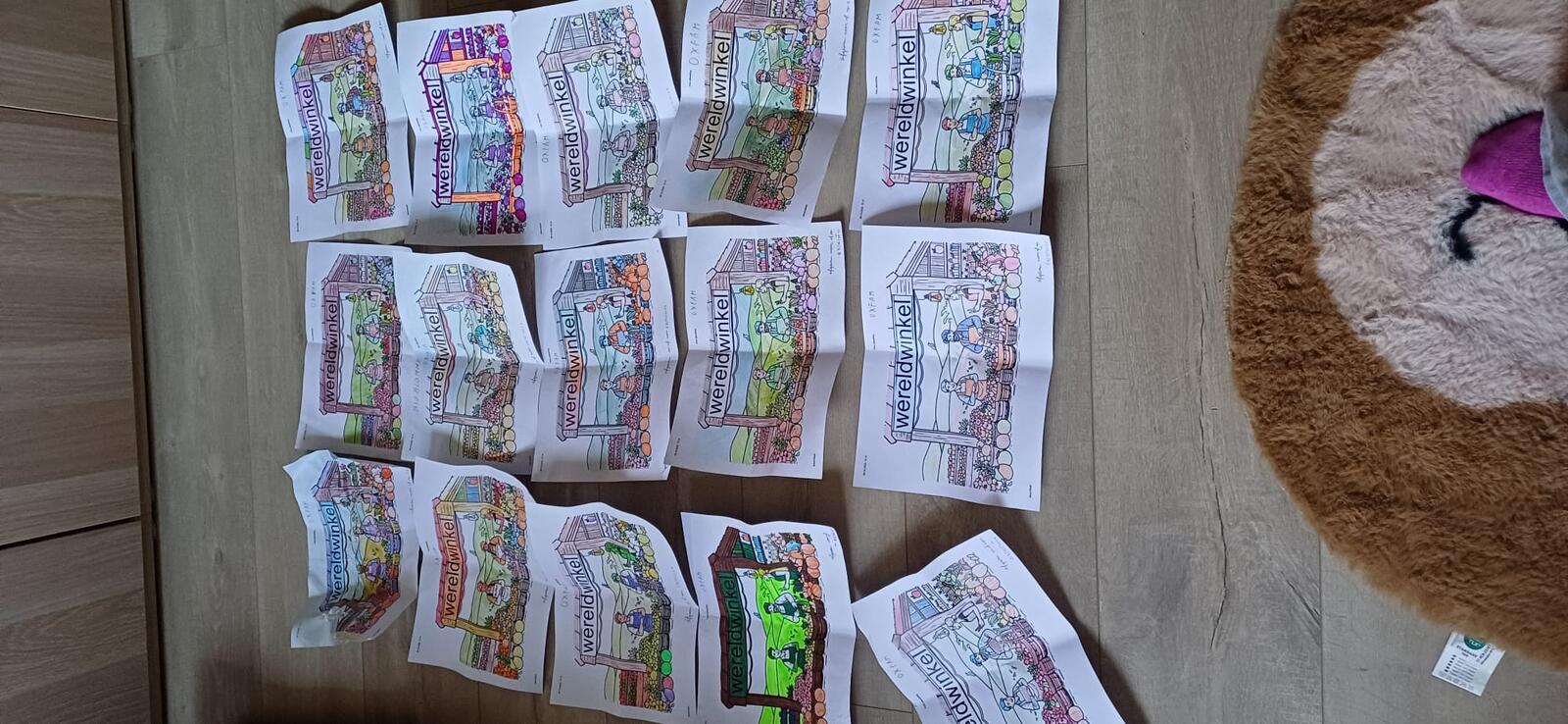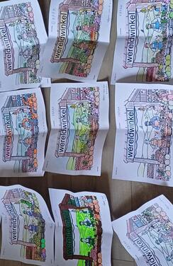 1 groep leerlingen, Kathleen + 2 andere leerlingen wiens namen de collega nog niet doorgekregen heeft, maakte kleurplaten, deelde deze uit en liet deze inkleuren om meer aandacht te vragen voor de wereldwinkels. Foto in bijlage: 1SWWC - 4.