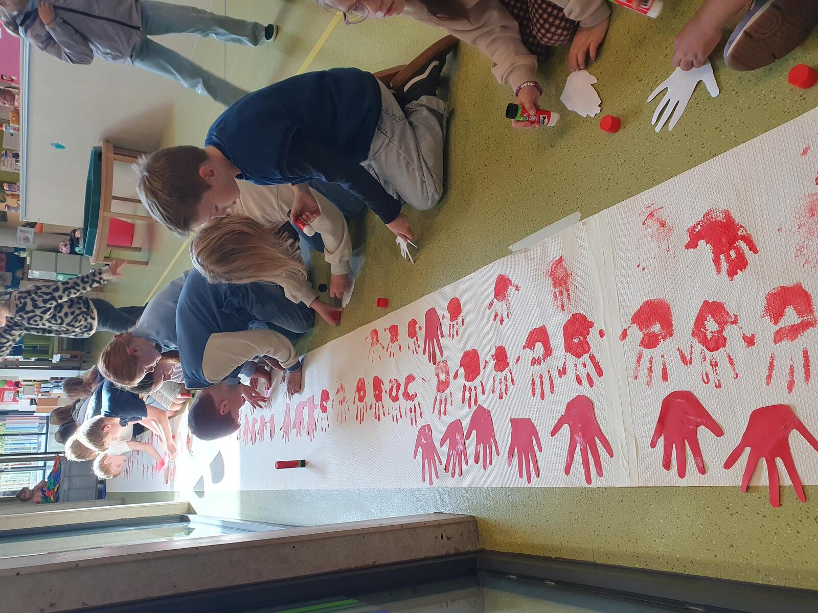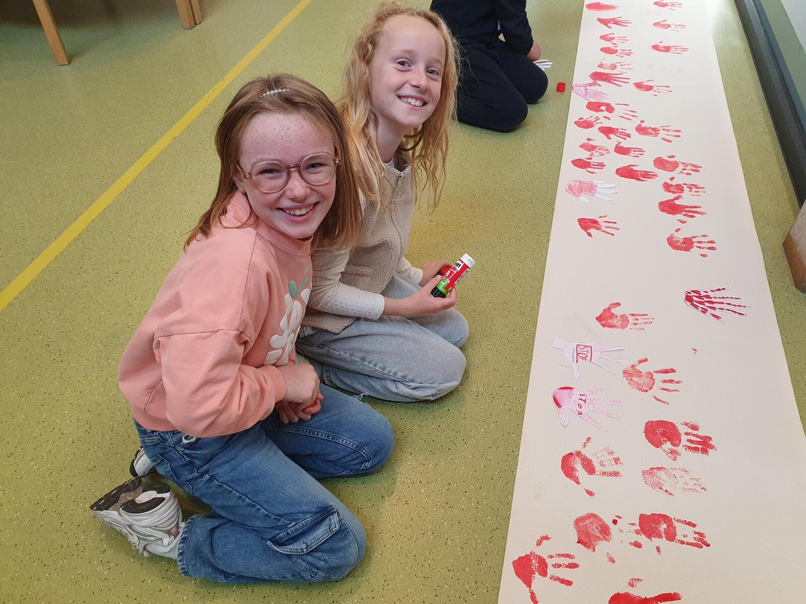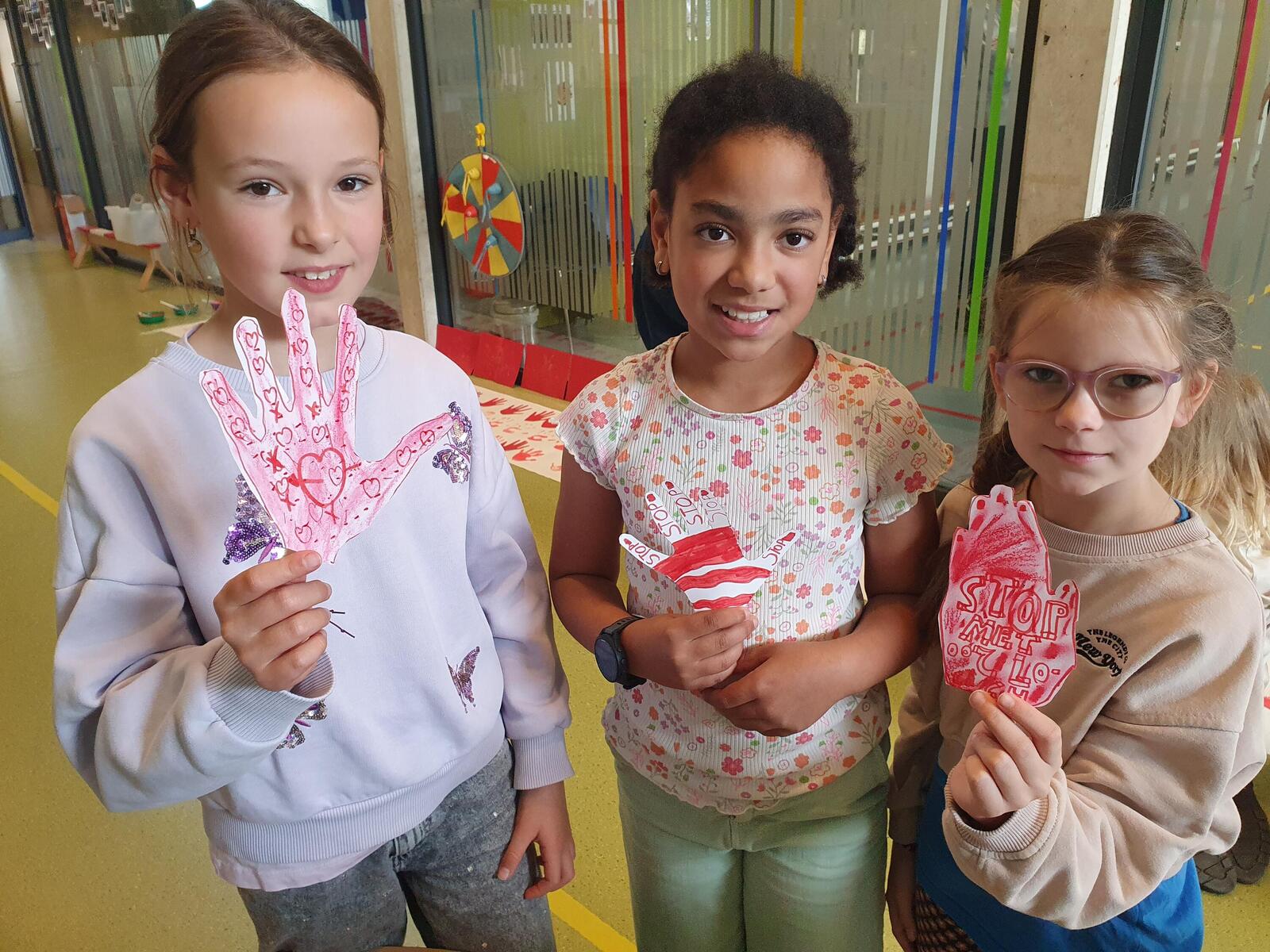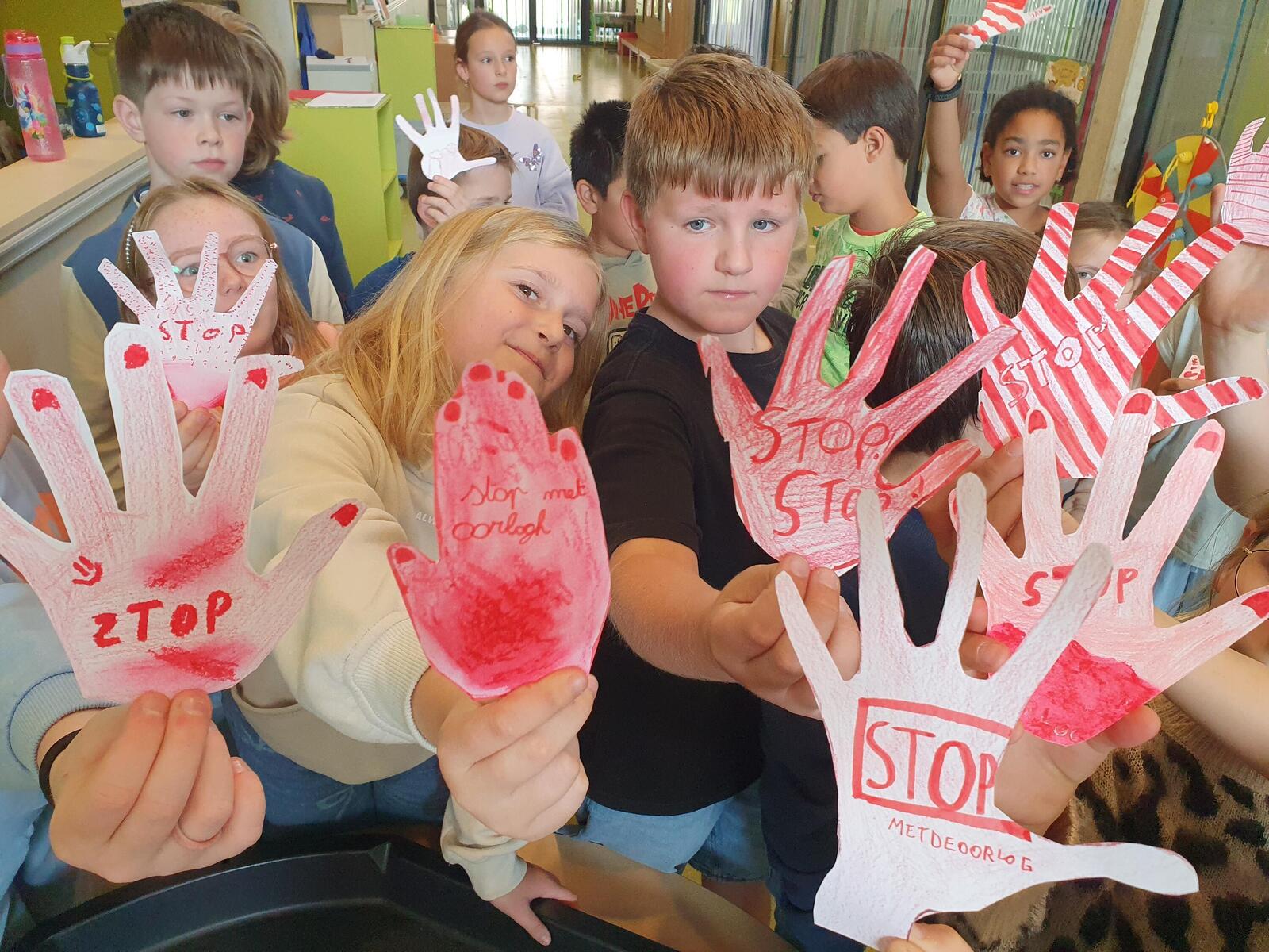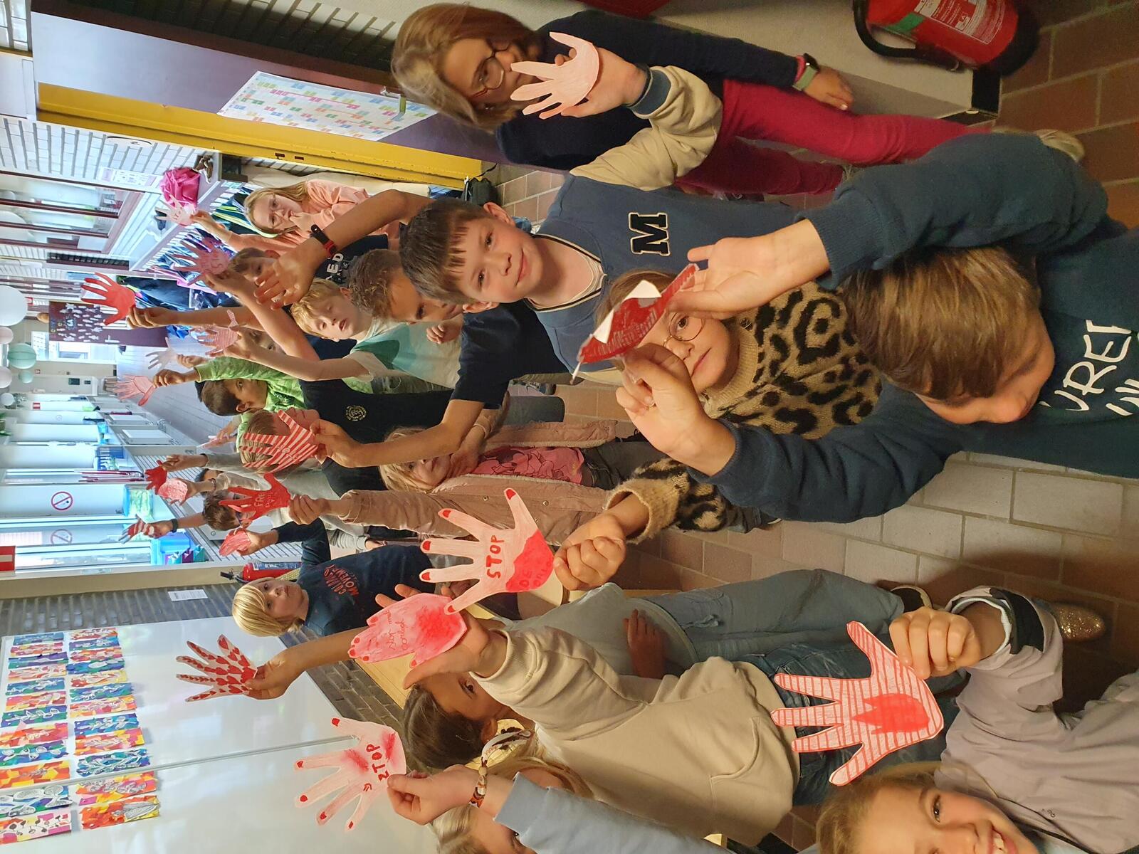 Met de hele school trokken we een meterslange rode lijn tegen de oorlog in Gaza. Ook wij staken onze handen uit en riepen "Stop" tegen oorlog.
