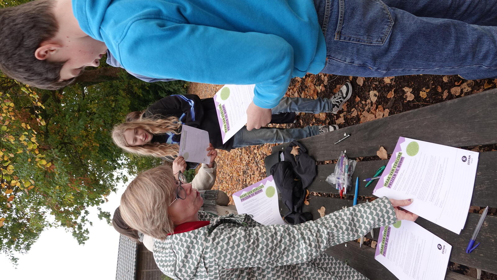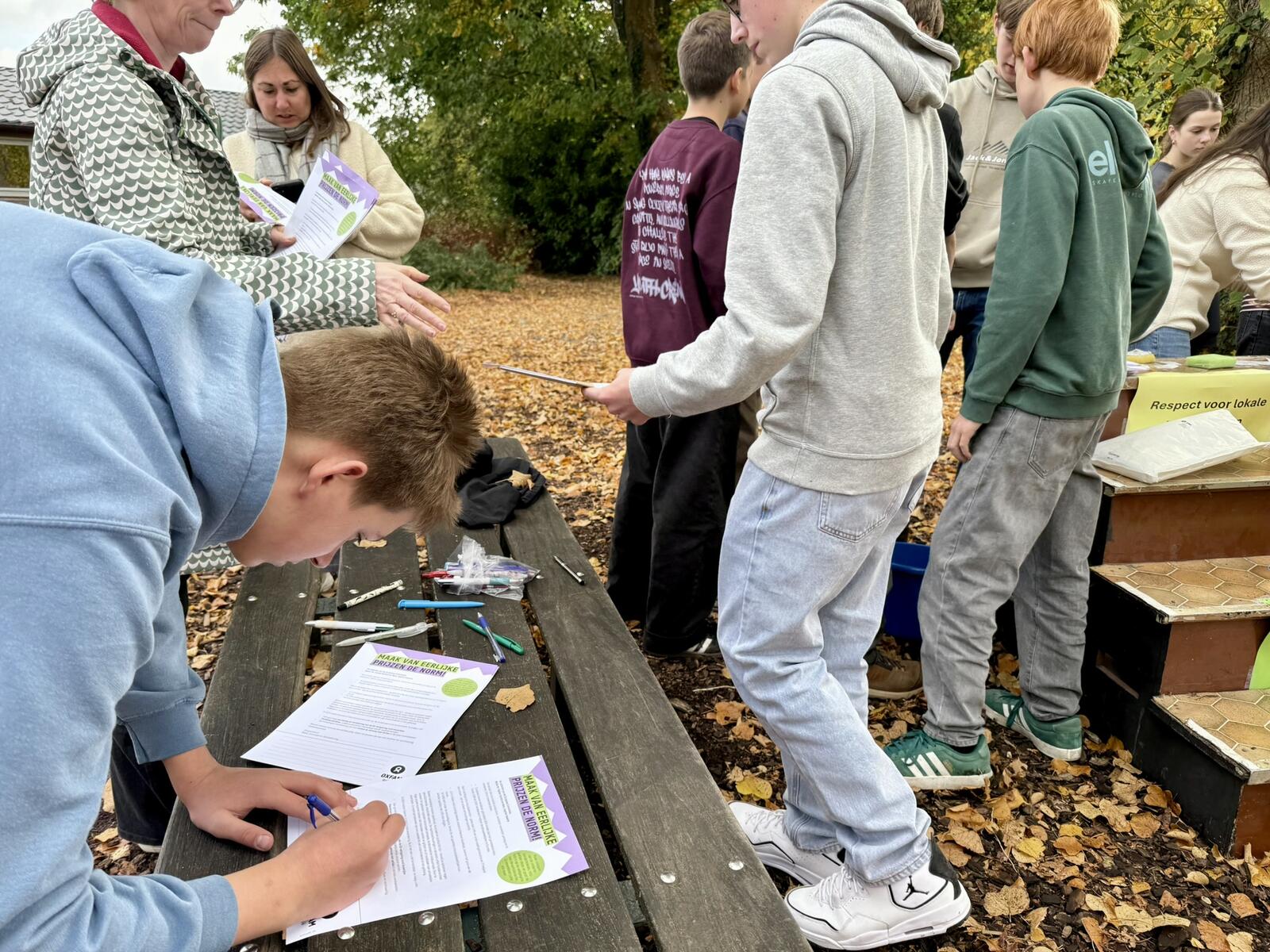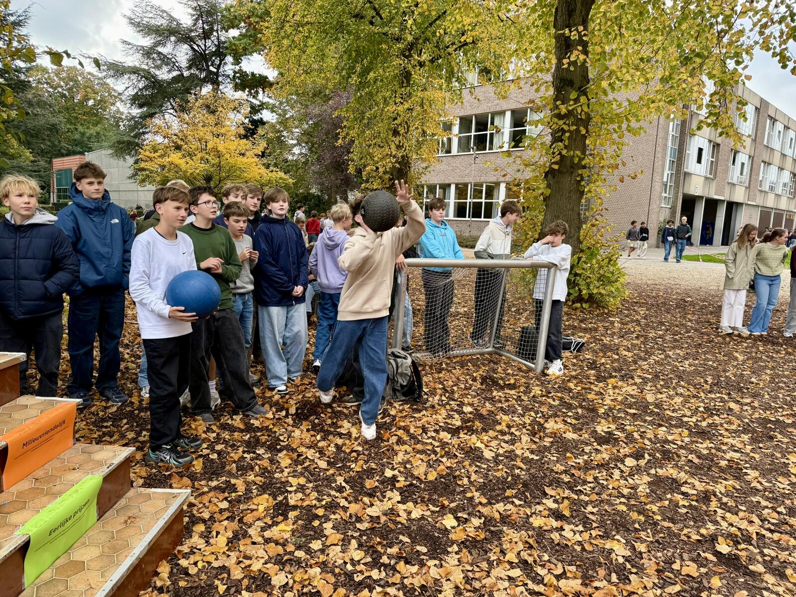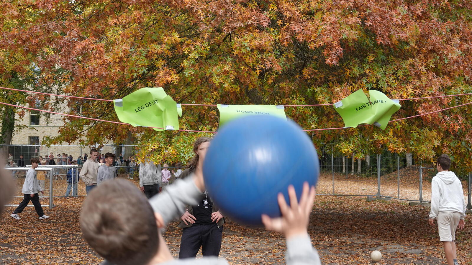Veel leerlingen kwamen testen of ze de krachtbal over de lat konden gooien. Opmerkelijk veel jongens bij deze actie. Nadat ze dat gedaan hadden, mochten ze doorschuiven naar de tattooshop en de petitietafel. 105 leerlingen ondertekenden de petitie. Veel leerlingen wilden een tattoo, verschillende leerlingen wilden er ook twee of drie. Tijdens het zetten van de tattoos en bij de petitietafel konden we dan het gesprek aangaan over de boodschap van de actie en uitleggen waarover de petitie inhoudelijk gaat. Fijn ook om te zien dat de leerlingen die al jarenlang meedoen in onze Wereldwinkel Op School ook hier weer present tekenden om de lat-actie en het tattoosalon te bemannen. De vier dagen na deze actie hebben we chips en chocolade verkocht op de speelplaats. Ook met veel succes.