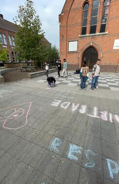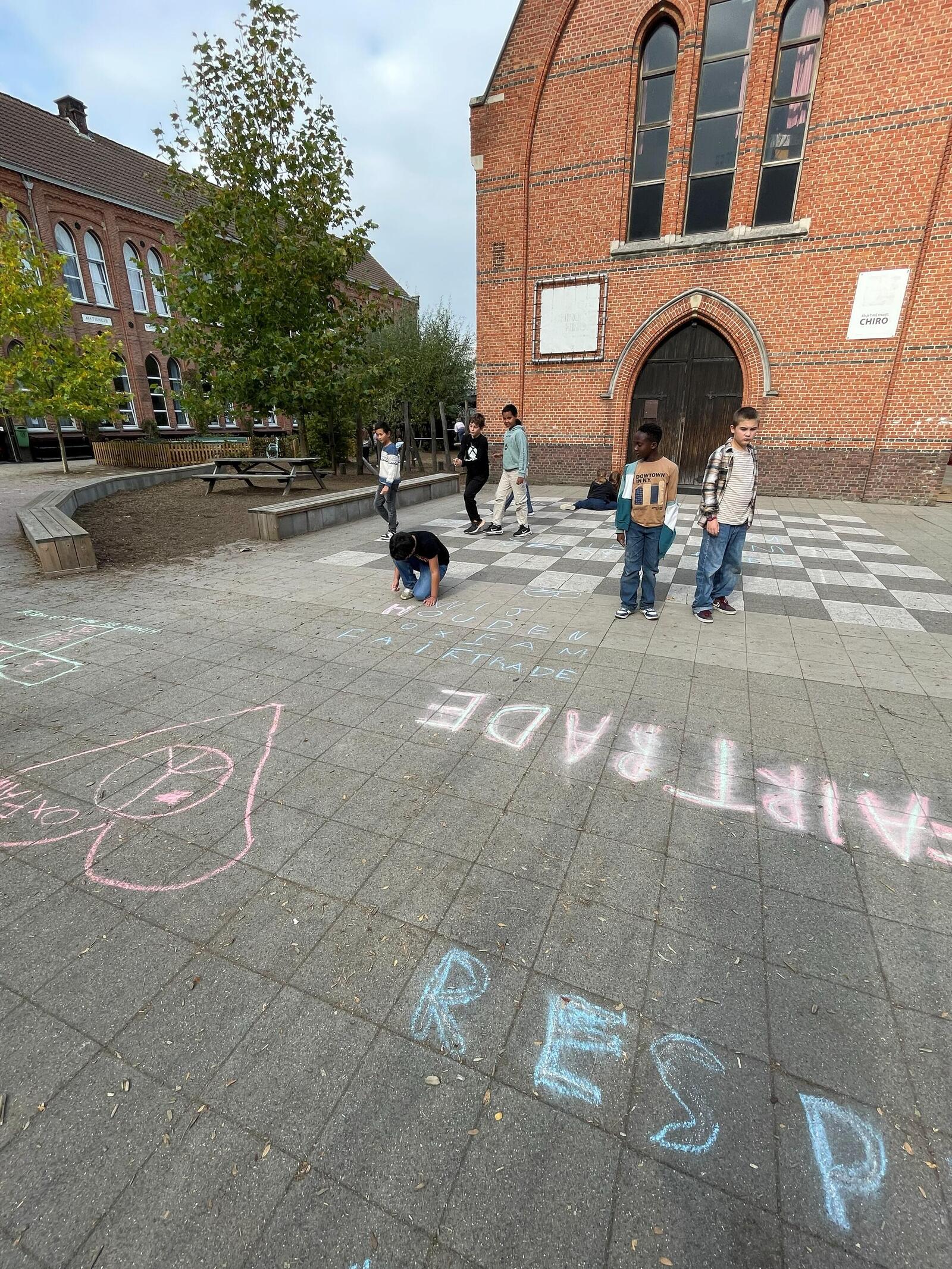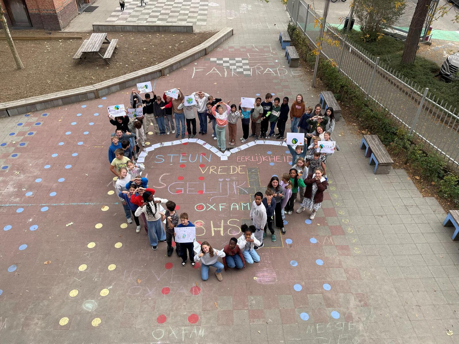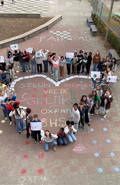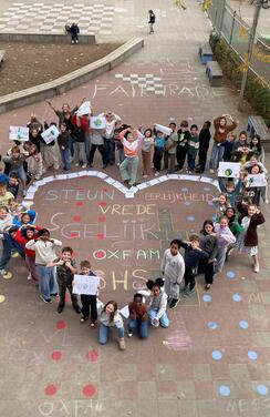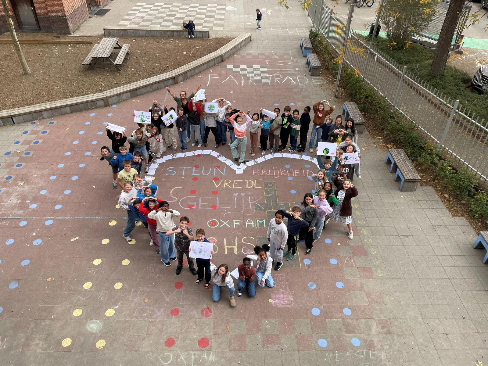 Wij zijn met onze twee vijfde leerjaren actief aan de slag gegaan. Na wat achtergrond gekregen te hebben & het Fairtade lied te hebben gezongen, zijn we aan het brainstormen geslagen en probeerden we met onze KLEINE groep een GROOT verschil te maken. We werkten verschillende ideeën uit en maakten hier 1 mooi geheel van met een DUIDELIJKE boodschap: 'STA STIL BIJ WAT JE DOET!' We gingen dan ook vol enthousiasme de straat op en verspreidden onze boodschap door mensen aan te spreken, door affiches te maken en door duidelijke boodschappen op straat te schrijven met krijt. Wij zijn alvast overtuigd dat we met onze leerlingen een VERSCHIL hebben gemaakt! Ook in onze school vormden we met onze leerlingen een hart, samengesteld uit onze petities en affiches en dat bestond uit sleutelwoorden gelinkt aan Fairtrade. We schreven ook op onze speelplaats korte, maar duidelijke boodschappen om zo onze andere leerlingen te prikkelen en tot denken aan te zetten. Als leerkracht hebben we dit van nabij mogen beleven en kunnen we bevestigen dat onze leerlingen er geslaagd in zijn een kleine groep te bereiken. Wij zijn alvast heel erg trots op die KANJERS van ons die het verschil proberen te maken! :-D