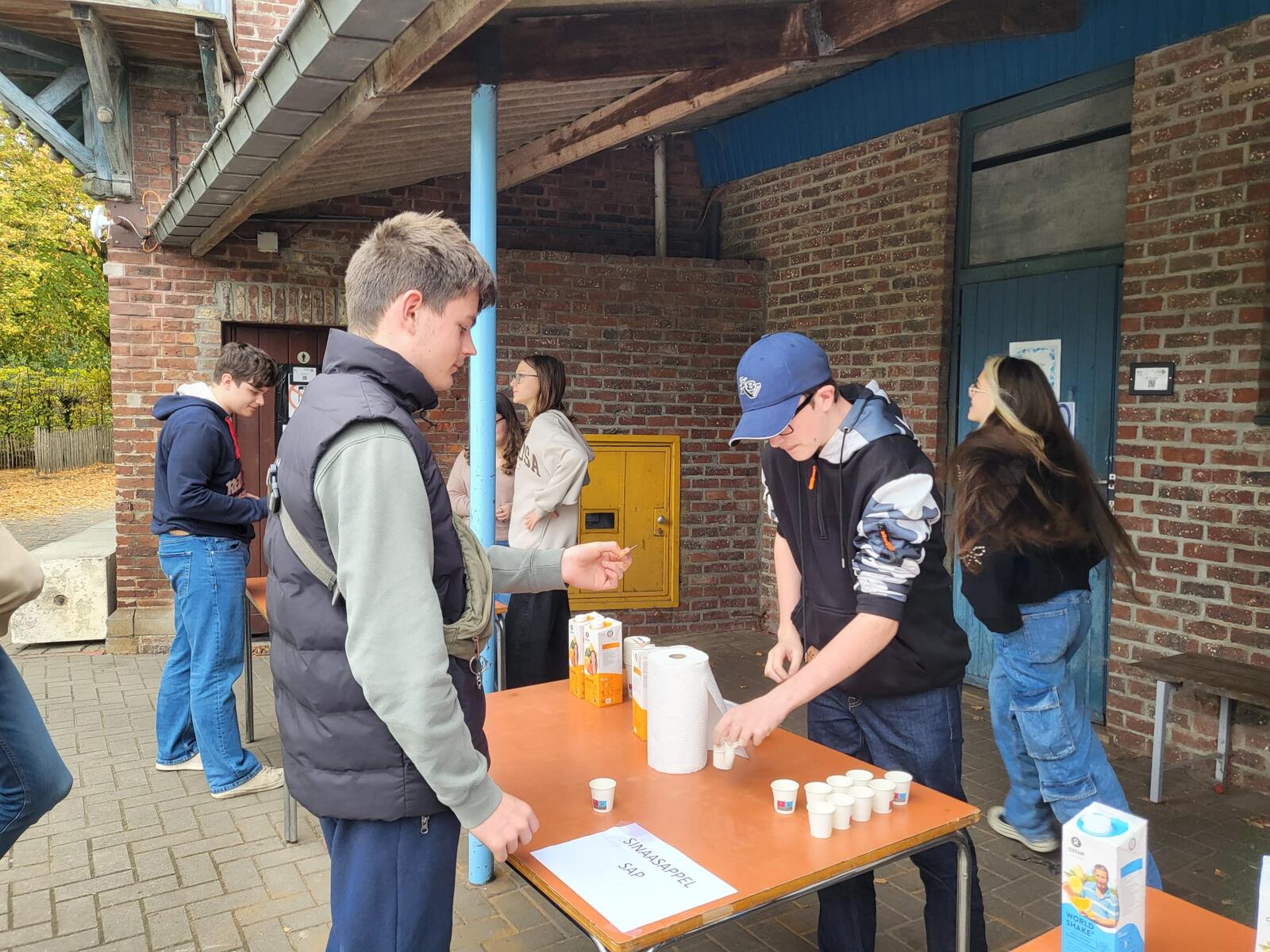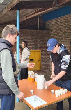 De leerlingen van 2A en 2B economie organiseren een sapjesverkoop op de speelplaats tijdens de middagspeeltijd. De leerlingen krijgen eerst een proevertje en kunnen nadien een bekertje sap kopen.